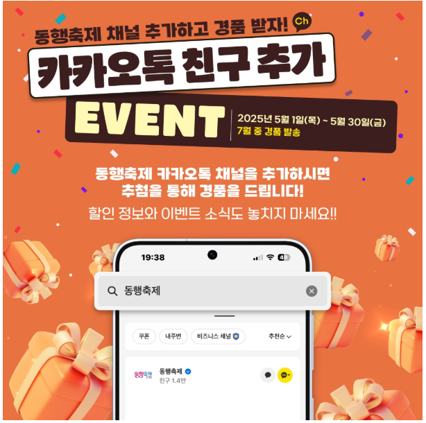 동행축제 카카오톡 채널을 추가하면 다양한 혜택을 받을 수 있는 카카오톡 친구 추가 이벤트도 준비되어 있습니다. 채널 추가 후 추첨을 통해 다양한 경품을 받을 수 있으며, 할인 정보와 이벤트 소식을 빠르게 받아볼 수 있습니다.