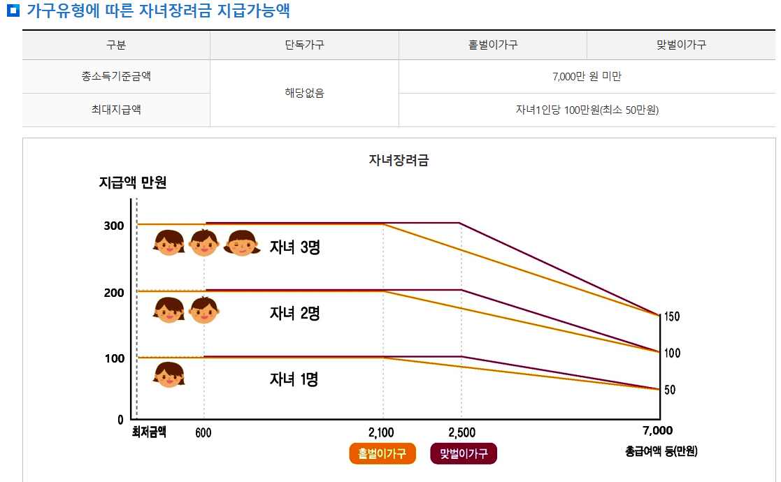 자녀 수 최대 지급액 (홑벌이/맞벌이 동일)