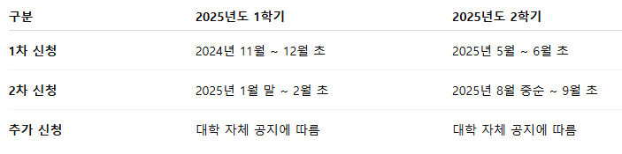 국가장학금은 연 2회, 정기신청과 추가신청 기간이 운영됩니다. 학기별로 다음과 같은 일정에 따라 신청이 진행됩니다.