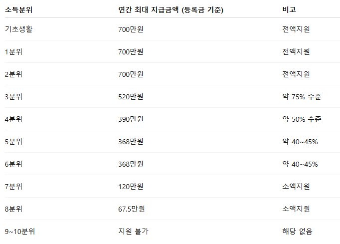 국가장학금은 소득분위에 따라 차등 지원됩니다. 2025년도 기준 장학금 지원금액은 다음과 같습니다.