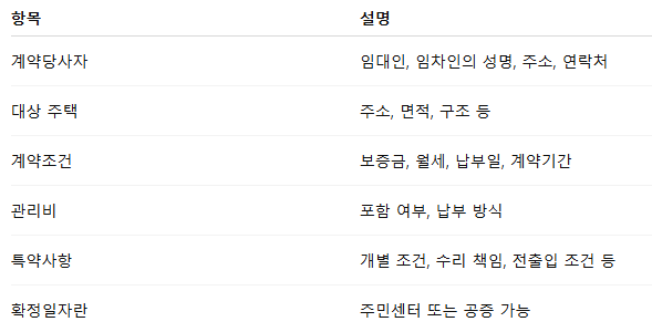 임대차 계약서의 기본 구조는 보증금, 월세, 계약기간, 해지조건, 관리비 등의 항목으로 구성됩니다. 정부는 표준임대차계약서 양식을 제공하고 있으며, 이를 기반으로 계약하는 것이 추후 분쟁 예방에 유리합니다.