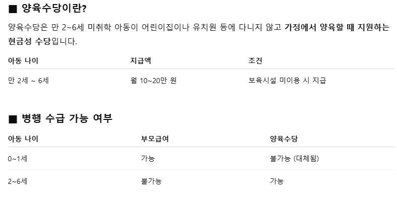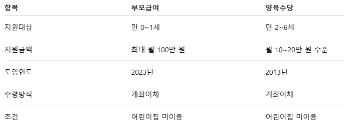 요약: 부모급여는 양육수당을 대체하거나 추가되는 개념이 아니라, 연령대별로 구분되어 별도 운영되는 제도입니다.