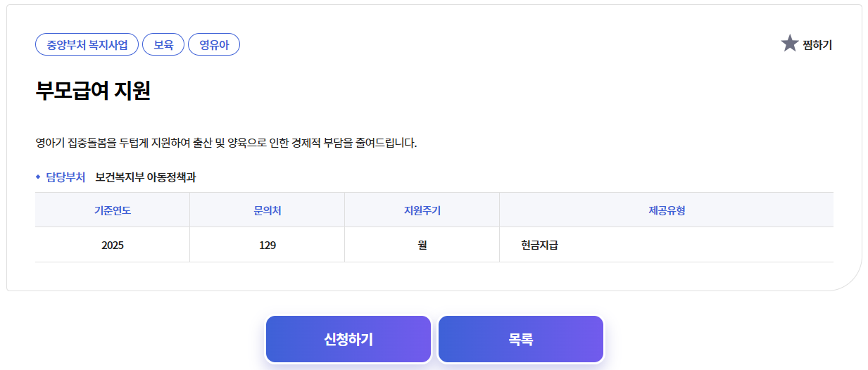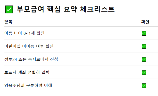 TIP: 보육시설을 이용하는 경우에는 부모급여 대신 보육료 지원을 받게 됩니다. 두 제도는 중복지원 불가입니다.